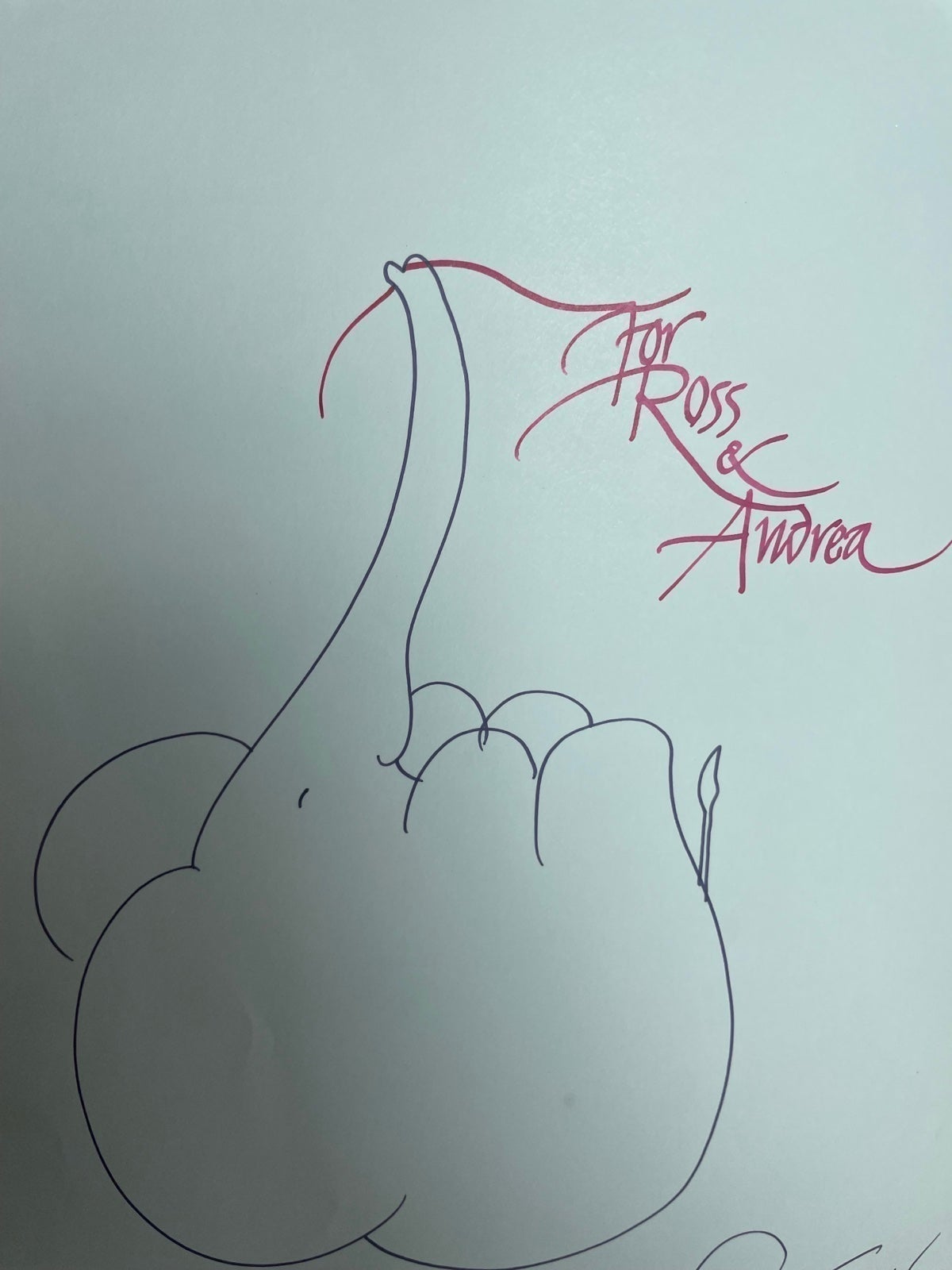 Clearing out space in my home (Marie Condo-style), and found this cool find in one of our book bins. Personalized note signed, "Love, Jose Aruego 3/25/85" underneath a hand drawn elephant holding red calligraphy lettering stating, "For Ross and Andrea".