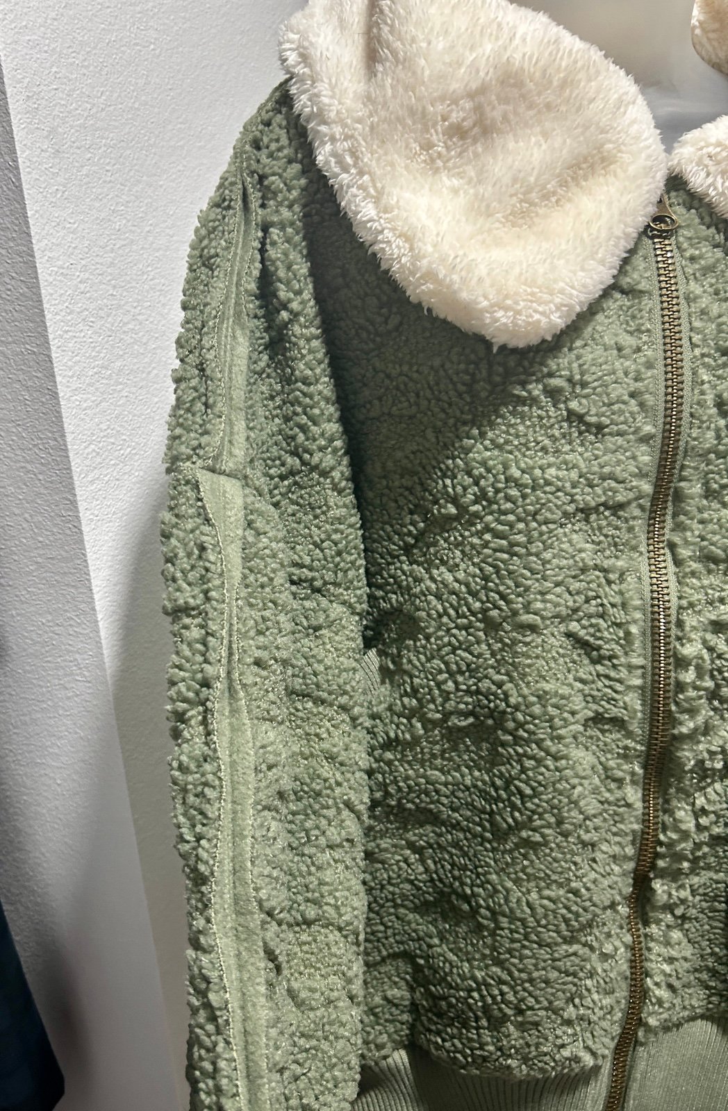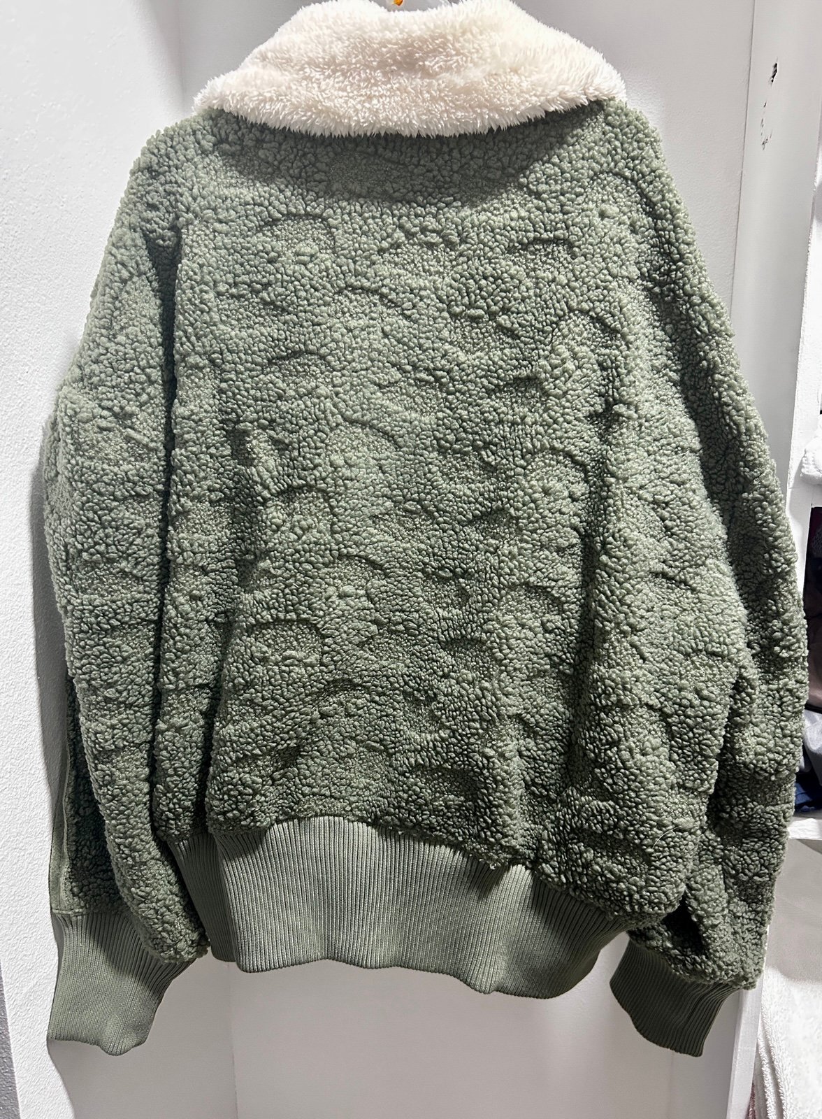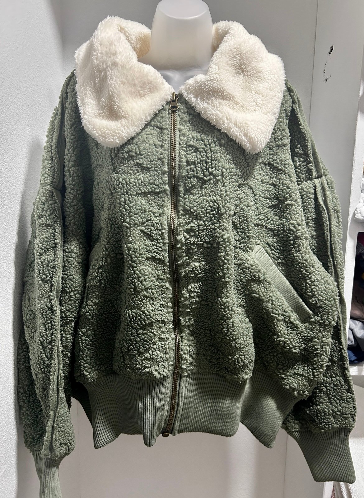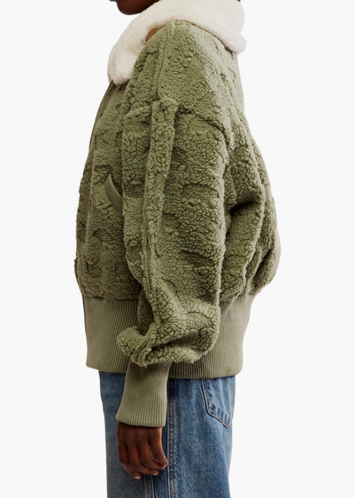 An exaggerated hem and cuffs frame a bomber-style zip-up cardigan that's made from nubby sculpted fleece and finished with a cozy faux-fur