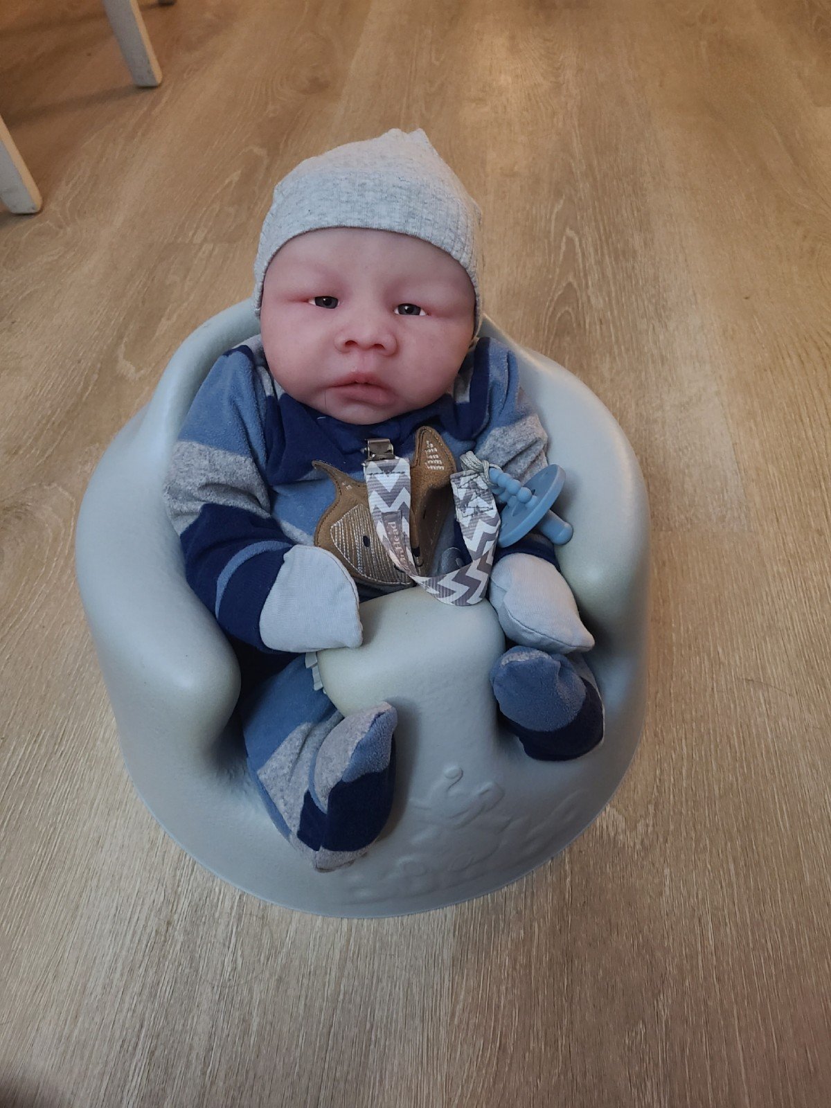 This is silicone cuddle Beau from Baby Biscuit Nursery on esty. She sculpts pours and paints her own silicone work. He does have some light peeling around his mouth. He is being sold as is. Please look at all pictures closely and feel free to ask any questions you may have before purchase, as I do not accept returns for any reason. He wears size 0 to 3 months and is a nice, heavy, chunky boy. He will come home with a small box opening. Including silicone powder, silicone powder bush. And pacifier lube for easy pacifier insertion.